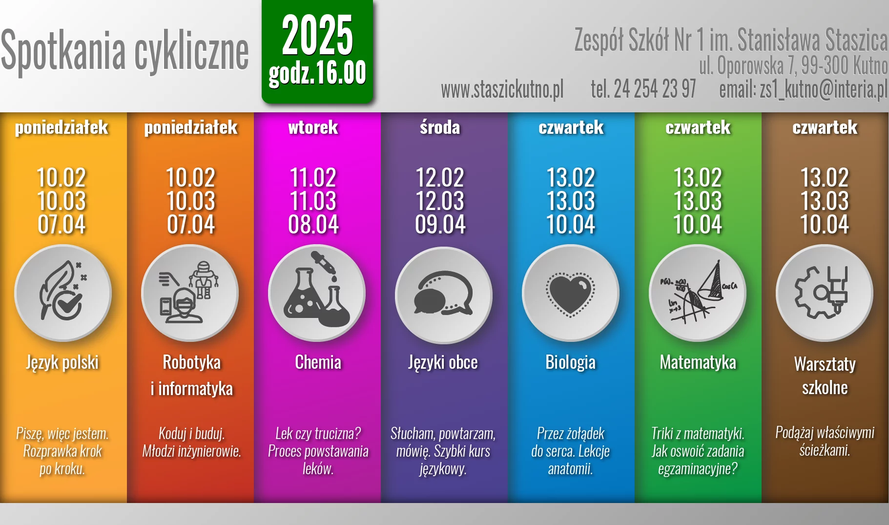 - W imieniu całej szkolnej społeczności Zespołu Szkół Nr 1 im. St. Staszica w Kutnie pragnę bardzo serdecznie zaprosić uczniów klas ósmych na cykliczne spotkania edukacyjne odbywające się w naszej szkole w okresie od 10 lutego do 10 kwietnia 2025 r. Mam nadzieję, że każdy z odwiedzających nas ósmoklasistów znajdzie wśród zaproponowanych bloków tematycznych te, które go interesują lub zainspirują. Może właśnie to wydarzenie rozwieje Wasze ewentualne wątpliwości, dotyczące przyszłości. Spotkania dają wyjątkową okazję poznania szkoły, która z wielką przyjemnością będzie gościć Was w swoich murach już jako uczniów Staszica. Serdecznie zapraszam! - pisze dyrektor Zespołu Szkół Nr 1im. St. Staszica w Kutnie, Agnieszka Wajgner-Matusiak.