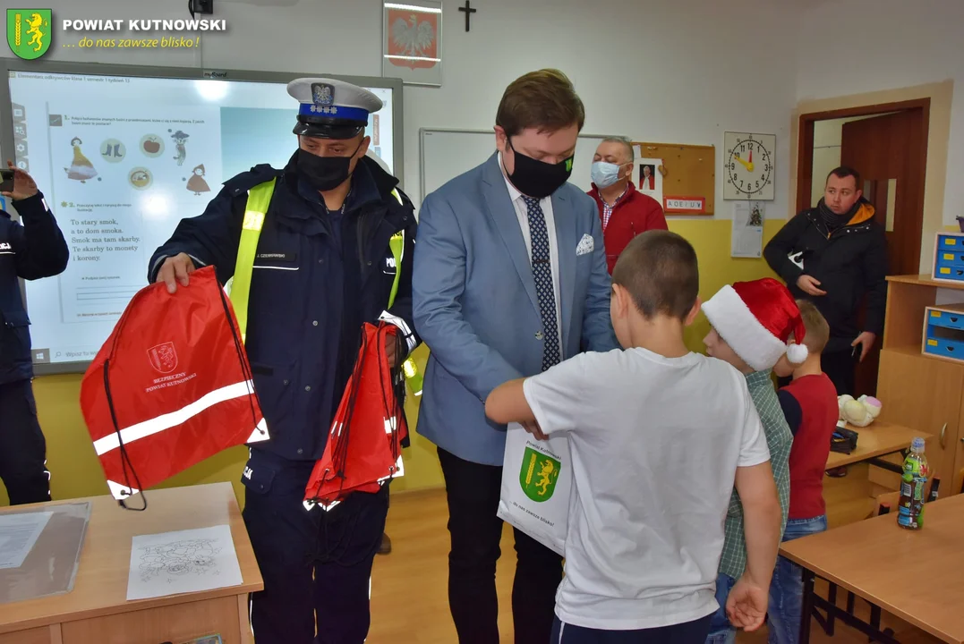 Mikołajkowa akcji Starostwa i policji. Rozdawali odblaski podopiecznym kutnowskich placówek | fot. Starostwo Powiatowe w Kutnie