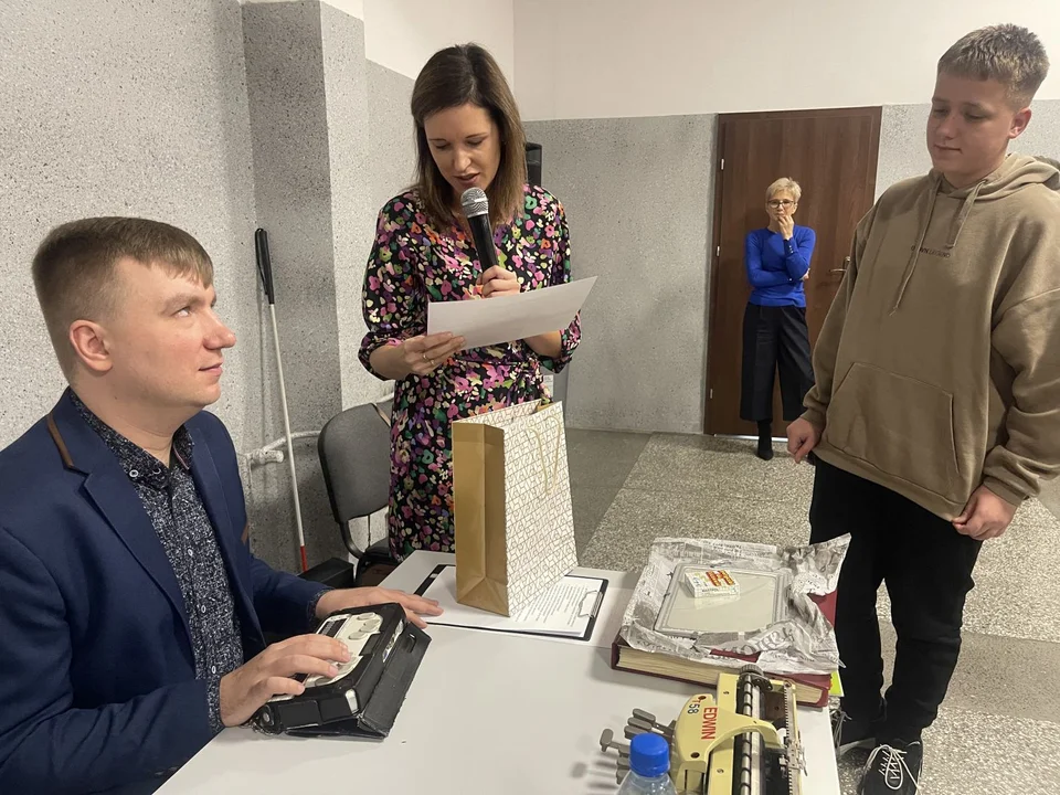 Z racji tego, że Pan Edwin jest osobą niewidomą, przybliżył nam pomoce, z których korzystał w trakcie nauki w szkole: pokazał, jak pisał na maszynie brajlowskiej, przeczytał fragment książki napisanej brajlem, zaprezentował urządzenie służące do przetwarzania dokumentów z brajla na pliki Word oraz specjalne linijki, ekierki, czy kostki do gry z wypukłymi kropkami. Pokazał nam również, jak to określił, swój „osobisty GPS”, czyli białą laskę dla osób niewidomych i zademonstrował, jak za jej pomocą się porusza. Pan Edwin opowiadał również o relacjach z rówieśnikami, o tym, czy często spotykał się w życiu z tzw. „hejtem” i jak sobie w takich sytuacjach radził. Wspominał o tym, że to „nie otoczenie się do niego dostosowywało, tylko to on musiał dostosować się do otoczenia”. Zarówno w szkole, jak i w pracy nie miał żadnej taryfy ulgowej, musiał zmobilizować się i wytrwale pracować.