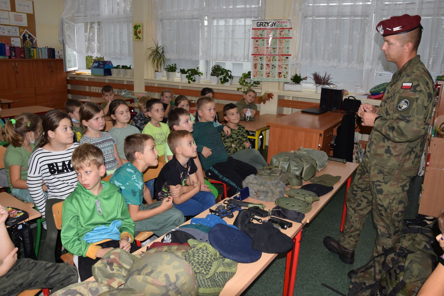 Pierwszy z gości, żołnierz jednostki w Leżnicy Wielkiej, w bardzo ciekawy sposób opowiedział dzieciom o swojej pracy. Przekonał młodych słuchaczy, jaki niezwykły zawód wykonuje. Przedstawił, jakie zadania wykonują żołnierze i jaką funkcję pełni wojsko w zakresie obronności kraju. Wskazał predyspozycje oraz umiejętności, którymi powinien wykazywać się kandydat na wojskowego. Zaprezentował umundurowanie, sprzęt oraz wyposażenie niezbędne w wojsku podczas wykonywania różnych, często trudnych misji.