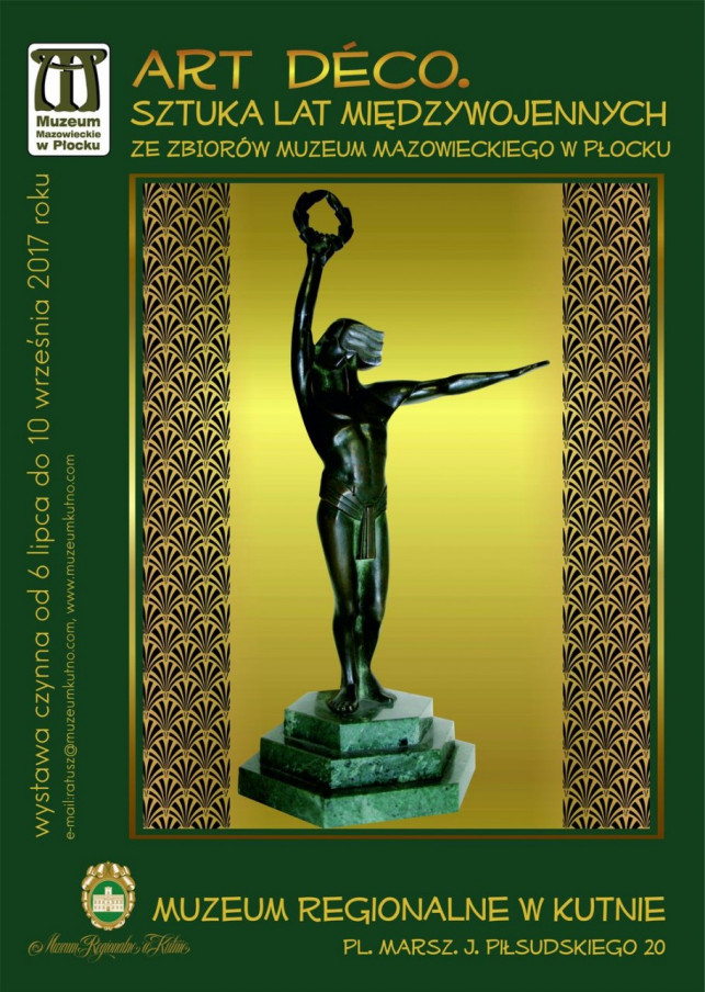 Wystawa “Art déco. Sztuka lat międzywojennych ze zbiorów Muzeum Mazowieckiego w Płocku”, stanowić będzie próbę odtworzenia atmosfery tych szalonych lat i nowoczesnych tendencji. Do Kutna przyjedzie fragment kolekcji budowanej w Płocku od ponad 10 lat i liczącej dziś blisko 1000 muzealiów pochodzących z manufaktur polskich, niemieckich, francuskich, austriackich, czeskich i amerykańskich. Na ekspozycji prezentowane będą prace malarskie i graficzne, dzieła sztuki użytkowej: meble, szkła, ceramiki, metale, a także zbiór mody, akcesoriów i biżuterii. Zgromadzone przedmioty to przykłady różnych form, technologii, inspiracji twórczych i zdobnictwa. Zapraszamy do bliższego zapoznania się z wyrobami sprzed prawie stu lat, które niezmiennie zachwycają starannością wykonania, elegancją kompozycji oraz szlachetnością materiałów.