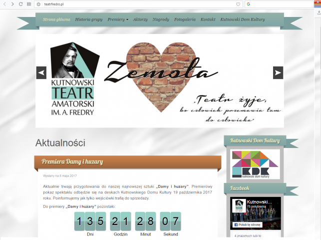 Kultura i EdukacjaKutnowski Teatr Amatorski im. A. Fredry, działający przy KDK, nareszcie ma swoją stronę internetową oraz profil na facebooku! Jeśli więc chcecie śledzić poczynania zespołu i wiedzieć, co w trawie (czyli w teatrze) piszczy, zaglądajcie regularnie na www.TeatrFredro.pl oraz na profil fb www.fb.com/TeatrFredro.