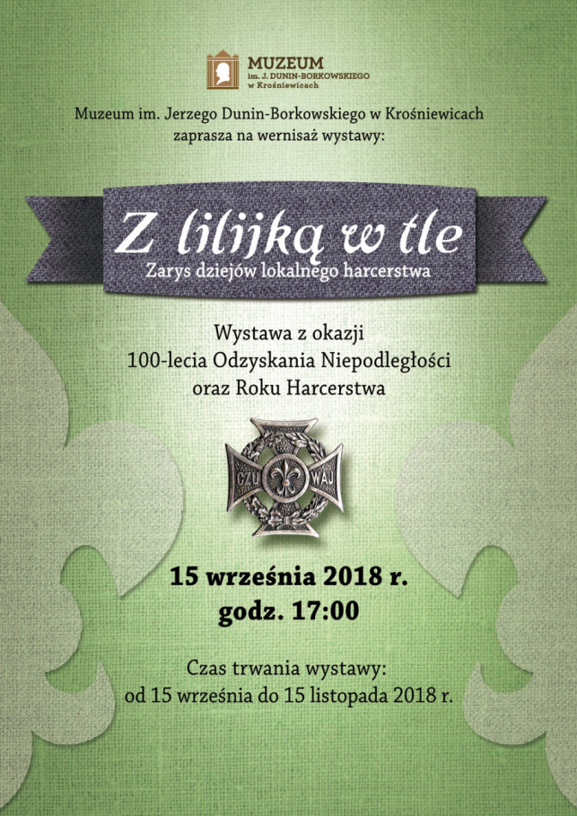 Kultura i EdukacjaSerdecznie zapraszamy wszystkich mieszkańców powiatu kutnowskiego na wernisaż wystawy "Z lilijką w tle. Zarys dziejów lokalnego harcerstwa". Uroczyste otwarcie odbędzie się 15 września 2018 o godz. 17:00. Wystawa powstała z okazji 100.rocznicy Odzyskania Niepodległości oraz Roku Harcerstwa.