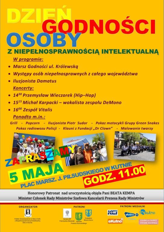 Kultura i EdukacjaPolskie Stowarzyszenie na rzecz Osób z Niepełnosprawnością Intelektualną Koło w Kutnie serdecznie zaprasza wszystkich mieszkańców Kutna i regionu do udziału w tegorocznych obchodach Dnia Godności Osoby z Niepełnosprawnością Intelektualną, które odbędą się 5 maja na placu Marsz. J. Piłsudskiego w Kutnie.