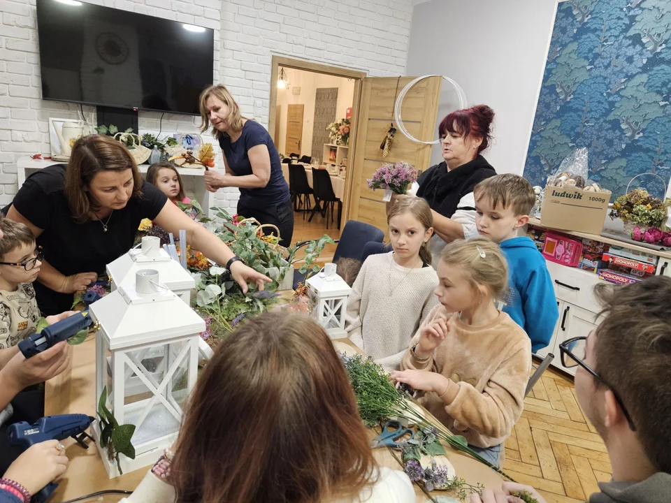 Podczas warsztatów beneficjenci wykonywali różnego rodzaju ozdoby na stół. Dzieci wraz z opiekunami przygotowywali kompozycje florystyczne, dekorowali świece, latarenki, szklane naczynia, itp. Każdy uczestnik wykonał indywidualną jesienną dekorację. Ponadto mogli wykazać się kreatywnością i innowacyjnością. Poznawali zasady savoir-vivre przy stole, przygotowywali odpowiednią zastawę stołową i nakryli stoły uwzględniając kolejność planowanych potraw.