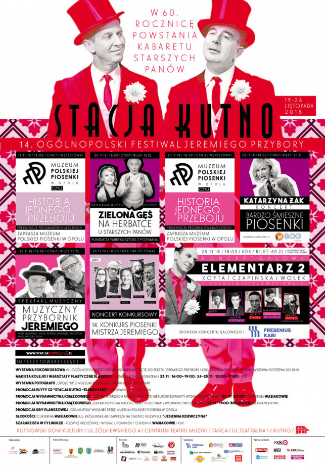 - godz. 18.00 – 14. Konkurs „Piosenki Mistrza Jeremiego”. Jury: ELŻBIETA ZAPENDOWSKA, DARIUSZ MICHALSKI, PAWEŁ SZTOMPKE, MIŁOSZ WOŚKO, DAREK SIKORSKI- sekretarz. Wejściówki w kasie KDK i CTMiT