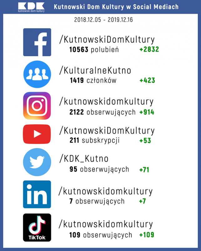 Infografika znajdująca się w galerii zdjęć przedstawia przyrost obserwujących na głównych profilach SM Kutnowskiego Domu Kultury na przestrzeni roku. Nieprzypadkowo Facebook jest na pierwszej pozycji. Jest najpopularniejszym portalem społecznościowym na świecie.