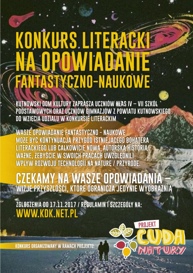 Wasze opowiadanie fantastyczno - naukowe może być kontynuacją przygód istniejącego bohatera literackiego lub całkowicie nową autorską historią. Ważne, żebyście w swoich pracach uwzględnili wpływ rozwoju technologii na naturę – przyrodę. Czekamy na Wasze opowiadania – wizje przyszłości, które ogranicza jedynie wyobraźnia.