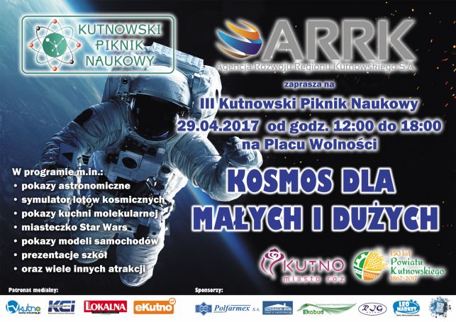 III Kutnowski Piknik Naukowy odbędzie się 29 kwietnia w godzinach 12.00 - 18.00 na Placu Wolności. Jak zapewniają Organizatorzy każdy znajdzie tu coś dla siebie, a doświadczenie podpowiada, że nie są to obietnice na wyrost. Oprócz prezentacji szkół i konkursów, które będą przez nie organizowane, podczas Pikniku będzie można wziąć udział w pokazach i degustacji kuchni molekularnej Colorfood, która jest połączeniem pasji kulinarnej z chęcią tworzenia na talerzu oryginalnych form i kompozycji kolorystycznych. Na scenie zobaczymy zespoły pokazowe i turniejowe dzieci i młodzieży ze Street Dance Studio Szkoły Tańca Joanny Gąsiorowskiej w kosmicznych prezentacjach tanecznych.