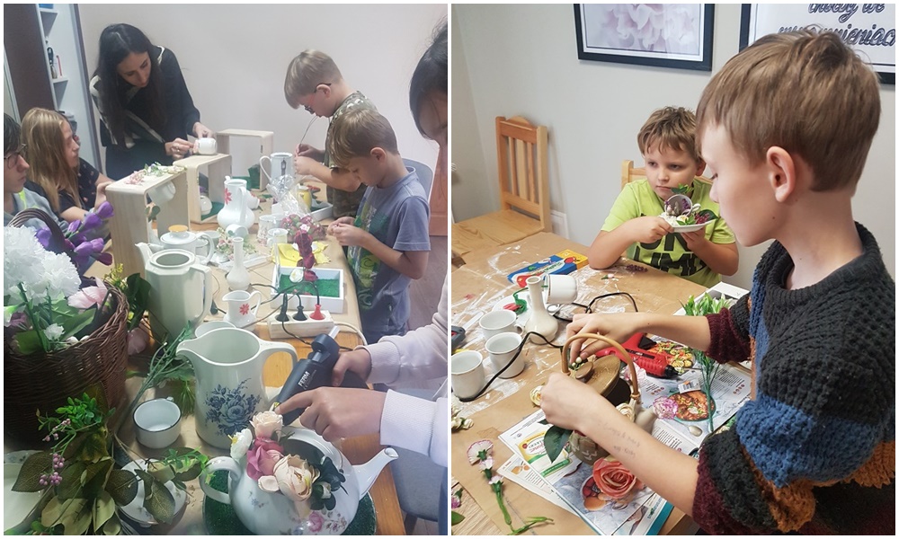 We wrześniu uczestnicy wzięli udział w warsztatach florystycznych, podczas których przygotowali prace przestrzenne na konkurs na najpiękniejszą kompozycję kwiatową z wykorzystaniem naczyń ceramicznych: dzbanków, filiżanek, buteleczek. Konkurs „Róża- królowa wszystkich kwiatów” zostanie rozstrzygnięty na koniec projektu.