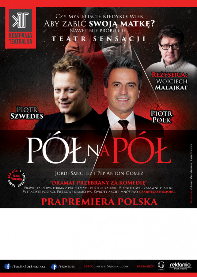 Spektakl Pół na pół w reżyserii Wojciecha Malajkata, z udziałem Piotra Szwedesa i Piotra Polka to zabarwiona czarnym humorem komedia z elementami kryminału opowiadająca o dwóch przyrodnich braciach, którzy jeszcze za życia swojej matki kłócą się o jej spadek. Dominik – młodszy brat (w tej roli znakomity Piotr Szwedes) – jest poddawany misternej grze, jaką prowadzi drugi z nich – starszy Robert (niezwykle sugestywny Piotr Polk), usiłujący za wszelką cenę wpłynąć na Dominika, aby ten zrzekł się spadku na jego korzyść. Na tym kończy się wstęp fabularny, zaczyna zaś prawdziwa, głęboka „wiwisekcja” relacji międzyludzkich, współczesnego świata, w którym tradycyjne wartości takie jak: miłość, szacunek dla drugiego człowieka, gotowość do poświęceń utraciły swoją wcześniejszą moc autentycznego uczestniczenia w życiu...