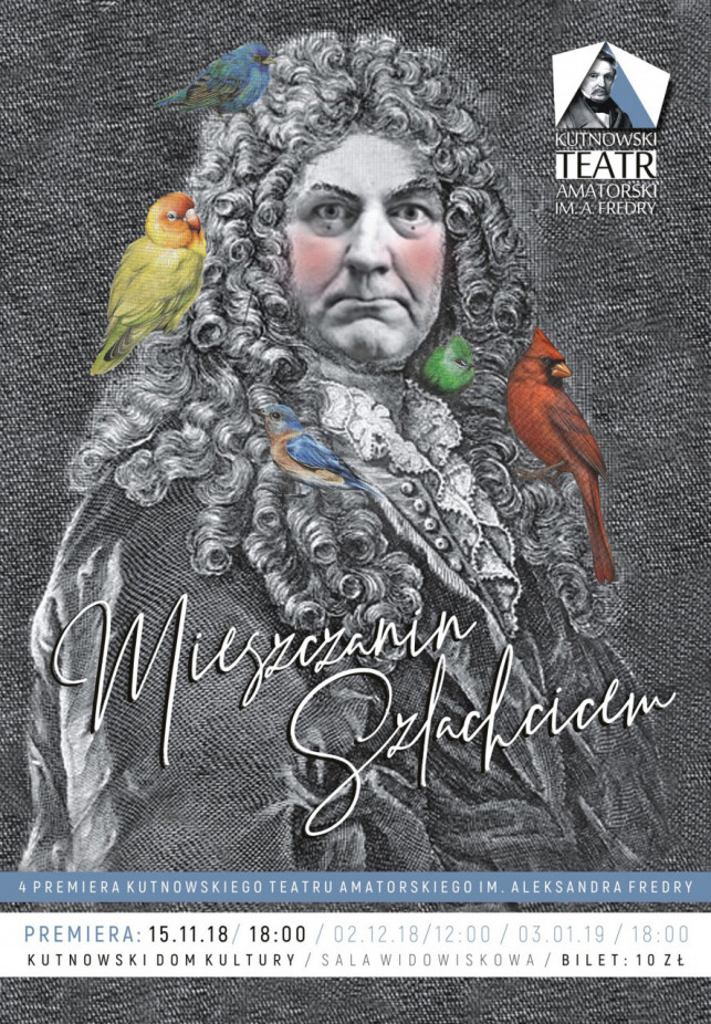 Tym razem będzie to komedia Moliera „Mieszczanin szlachcicem”. Duże, kostiumowe widowisko, w którym udział wezmą aktorzy znani już kutnowskiej publiczności oraz ci, którzy w swych rolach zadebiutują. Przed wielu laty, w przedstawieniu Teatru TV, rewelacyjną kreację głównego bohatera stworzył niezapomniany Bogumił Kobiela (reż. Jerzy Gruza). Na scenie KDK rolę Pana Jourdain zagra Krzysztof Murzynowski. A towarzyszyć mu będzie ponad dwudziestoosobowa galeria barwnych postaci i typów przeróżnych, także spod ciemnej gwiazdy…