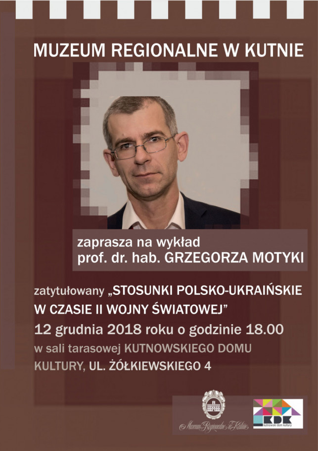 Prelekcja dotyczyć będzie "Stosunków polsko - ukraińskich w czasie II wojny światowej". Zapraszamy 12 grudnia o godz. 18:00 do sali tarasowej w Kutnowskim Domu Kultury. Wstęp wolny.