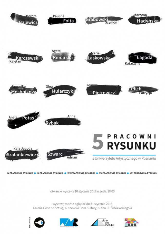 Dorota Balewicz, Paulina Folta, Szymon Grabowski, Martyna Hadyńska, Kajetan Karczewski, Agata Konarska, Maria Laskowska, Katarzyna Łagoda, Veronika Moshnikova, Olga Mularczyk, Joanna Pietrowicz, Patrycja Plich, Aneta Potaś, Anna Rybak, Kaja Jagoda Szałankiewicz, Adrian Szwarc. To ich prace będziemy mogli podziwiać już 10 stycznia od godz. 18:00 w Galerii Okno na Sztukę w Kutnowskim Domu Kultury.