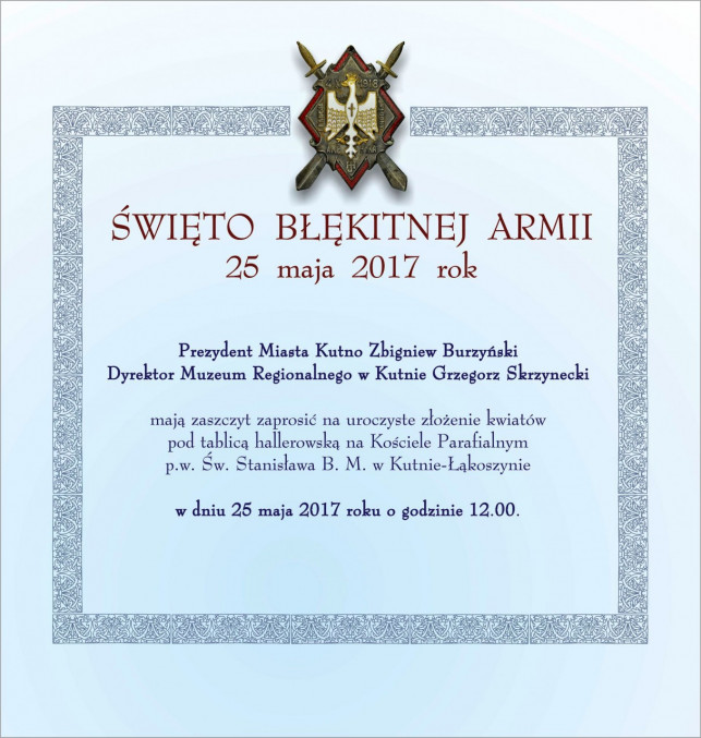 Prezydent Miasta Kutno oraz Dyrektor Muzeum Regionalnego w Kutnie zapraszają do udziału w obchodach Święta Błękitnej Armii. Uroczyste złożenie kwiatów pod tablicą hallerowską na Kościele Parafialnym p. w. Św. Stanisława B. M. w Kutnie-Łąkoszynie odbędzie się w czwartek 25 maja o godz. 12:00.