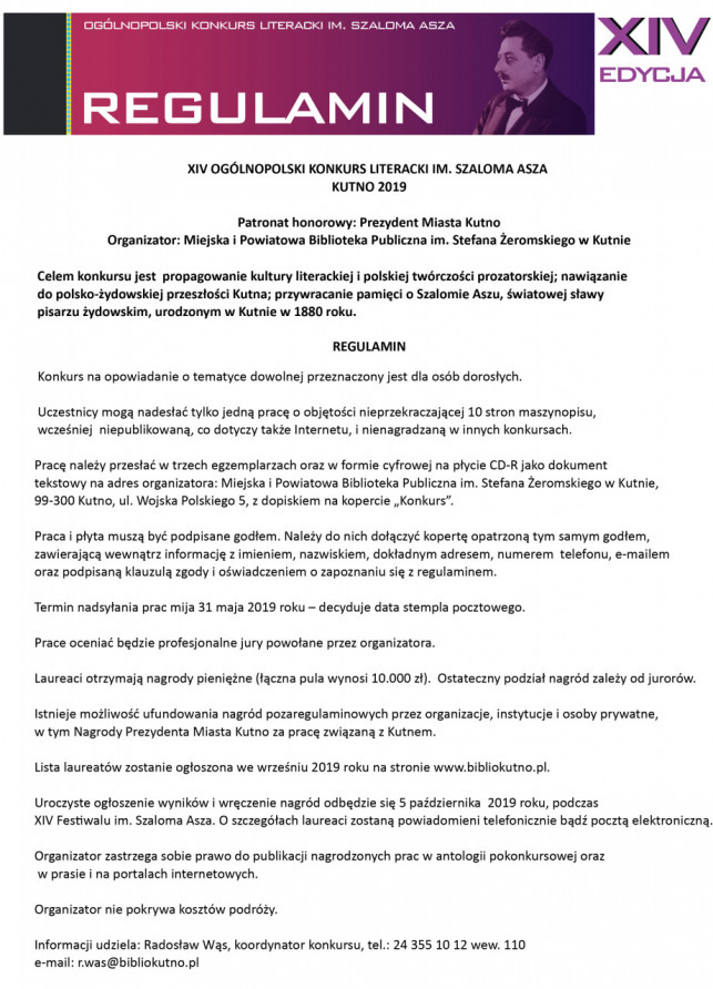 Kultura i EdukacjaMiejska i Powiatowa Biblioteka Publiczna im. Stefana Żeromskiego w Kutnie zaprasza do udziału w XIV Ogólnopolskim Konkursie Literackim im. Szaloma Asza.