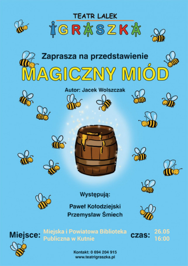 Kultura i EdukacjaMiejska i Powiatowa Biblioteka Publiczna w Kutnie zaprasza na spektakl dla dzieci w wykonaniu teatru Igraszka pt. "Magiczny miód". Przedstawienie odbędzie się 26 maja o godz. 16.00.