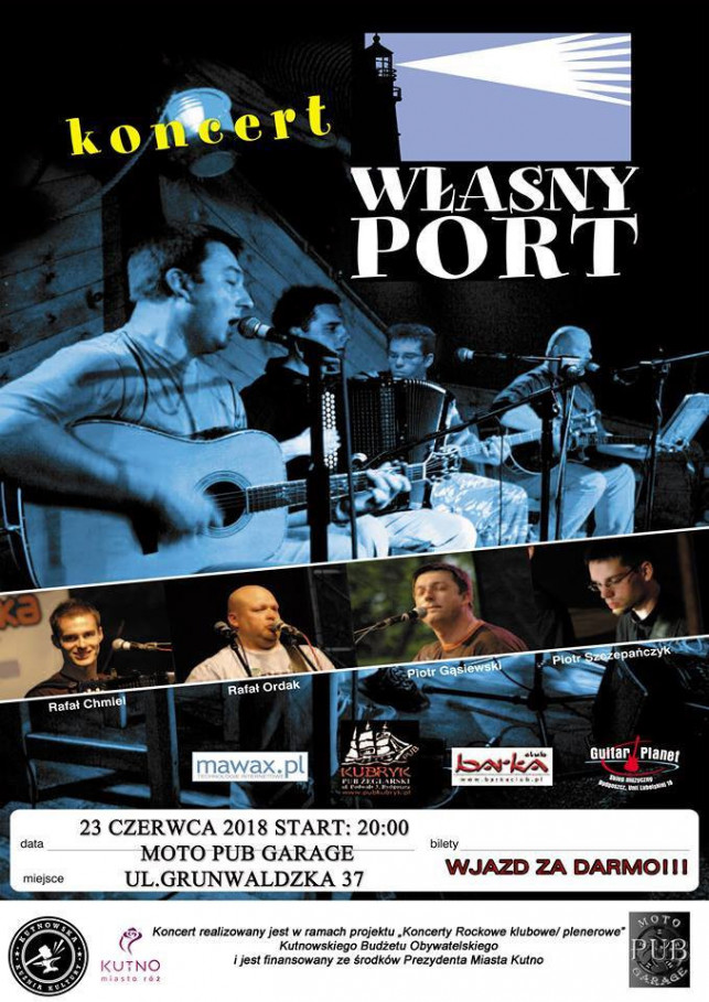 ...było to roku pańskiego 2003, w ten wrześniowy wieczór w powietrzu czuć było, że coś się musi wydarzyć, coś co sprawi, że życie wielu ludzi już nigdy nie będzie takie samo. Piotrek Gąsiewski, nietuzinkowy gitarzysta, miał pomysł, dziś już nikt nie pamięta czemu podzielił się nim z Rafałem Ordakiem choć nie widzieli się od wielu lat. Grunt, że miesiąc później odbył się pierwszy występ tego bezimiennego duetu. Tydzień po tym, za sprawą Marcina Kijaka, wiecznie zaspanego basisty było to już trio. Narodził się "Własny Port" (Matką chrzestną zespołu została Haneczka Gąsiewska: to ona nadała mu imię). I tak "Własny Port" wkradł się do serc Bydgoszczan koncertując w poniedziałki na Barce (to już historia - obecnie koncerty nie odbywają się), Pub żeglarski Kubryk stał się domem zespołu w każdą środę, a Tawerna co wyrosła przy drodze do Gdańska przygarnia go pod swoją gościnną strzechę co piątek. Przyjaciół Własny Port zdobywa tam, gdzie się tylko pojawia. Toruń, Swornegacie, Sopot, Mrągowo, Warszawa, Łódź, Wrocław to ciepłe przystanie, gdzie zespół chętnie zawija. Obecny skład powstał dzięki Marcinowi, choć w sposób niezamierzony. Złamanie ręki basisty sprawiło, że w zastępstwie pojawił się przecudnej urody oraz talentu akordeonista Rafał Chmiel. Po cudownym ozdrowieniu basisty, Chmiel był już na stałe związany z zespołem. Różnie się splatają ścieżki życia, więc wędrując za chlebem Kijak zamieszkał w odległym grodzie a że cztery to dobra liczba, jego miejsce zajął niesforny Sebastian Alichniewicz, basista, nazywany przez kolegów Czesiem...