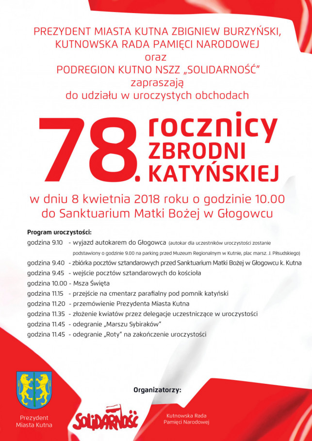 - 9:10 – wyjazd autokarem do Głogowca (autokar dla uczestników uroczystości zostanie podstawiony o godz. 9:00 na parking przed Muzeum Regionalnym w Kutnie, plac marsz. J. Piłsudskiego),