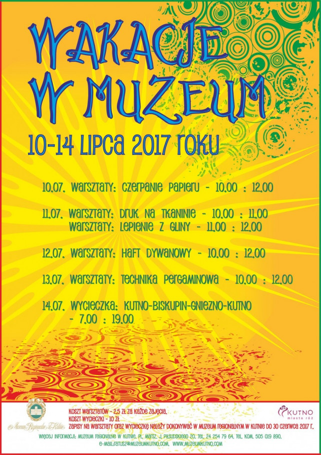 Kultura i EdukacjaMuzeum Regionalne w Kutnie zaprasza dzieci do spędzenia „Wakacji w Muzeum". W dniach 10-13 lipca zorganizowane zostaną warsztaty, m.in. czerpania papieru i druku na tkaninie, zaś 14 lipca odbędzie się wycieczka do Biskupina (Muzeum Archeologiczne w Biskupinie) i Gniezna (Muzeum Początków Państwa Polskiego, katedra gnieźnieńska, fabryka bombek).Zajęcia płatne – warsztaty – 2,50 zł za każdy dzień, wycieczka - 10 zł. Zapisy będą przyjmowane w Muzeum Regionalnym w Kutnie do 30 czerwca.