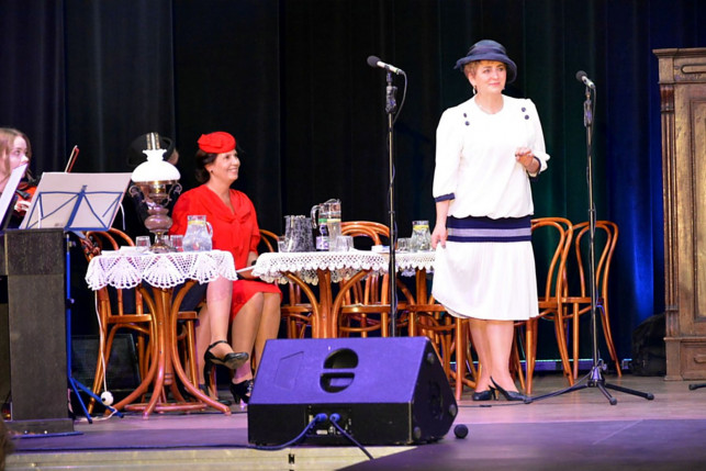 Na drugą część widowiska złożyły się piękne kompozycje ze znakomitymi tekstami, napisane w okresie dwudziestolecia – tanga, utwory o miłości traktujące temat poważnie i z przymrużeniem oka, piosenki satyryczne dotyczące różnych aspektów życia Polaków po odzyskaniu niepodległości, słowem: hity II Rzeczypospolitej. W programie wieczoru znalazły się też genialne skecze Konstantego Ildefonsa Gałczyńskiego i Juliana Tuwima. Spektakl miał walory edukacyjne – odbiorcy poszerzyli swoją wiedzę nie tylko o modzie i kulturze tamtego okresu, ale też o tym, jak spędzano wolny czas, jakie panowały obyczaje towarzyskie, z czego słynęli ówcześni celebryci, a nawet o tym, jaki wpływ miał film na rynek tekstyliów. Mówiono o osobliwościach i smaczkach międzywojnia, niezwykle interesujących, bo był to okres obfitujący w talenty, osobowości i osobliwości. W tamtym czasie radość z odzyskanej niepodległości dominowała nad biedą, kłopotami aprowizacyjnymi, trudnościami codziennego życia, była źródłem optymizmu, pomagała przetrwać, ale też stymulowała rozwój wielu dziedzin kultury i gospodarki. Z pewnością możemy dziś pozazdrościć ówczesnym Polakom energii, talentu, uśmiechu i klasy.