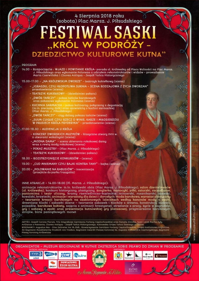 Nie sposób jest wymienić wszystkich atrakcji czekających na Państwa w dniu 4 sierpnia. Impreza rozpocznie się o godzinie 14 i potrwa do wieczora. Zapraszamy w swoistą podróż w czasie; to niepowtarzalna szansa na ciekawe i twórcze spędzenie wolnego czasu. Sobota będzie mienić się feerią barw, a kolorytu doda jej różnorodność i oryginalność rozwiązań artystycznych. Festiwal Saski zagościł na stałe w kalendarzu wakacyjnych imprez kulturalnych w Kutnie, a jego zasięg obejmuje województwo a nawet Polskę.