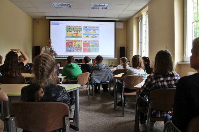 Dzisiejszy gość opowiedział o komiksach, ich rodzajach, procesie ich powstawania, a zanim uczestnicy warsztatów przystąpili do tworzenia własnych dzieł, podkreślał, że najważniejszy jest scenariusz, a nie tylko piękne rysunki. Jak dodał, dobra historia obroni się sama i doklejanie byle jakiej opowieści do cudownych obrazków na siłę mija się z celem.
