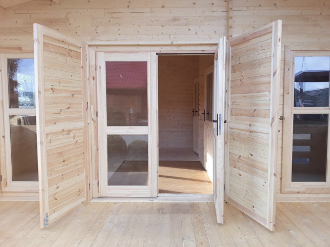 Posiadając kominek lub palenisko, warto mieć odpowiednie miejsce do przechowywania zapasu drewna, w którym będzie ono osłonięte, a jednocześnie dobrze przewietrzane. Ten model pozwala zapewnić miejsce na jedno i drugie. W dobudowanej drewutni można ze spokojem suszyć drewno, a wnętrze domku wykorzystać do przechowywania narzędzi, kosiarki, rowerów itd. Jeśli postawisz domek na działce rekreacyjnej może on swobodnie pełnić funkcję pomieszczenia dziennego, w którym zrelaksujesz się np. czytając książkę. Wykonany został z dbałością o detale nadające mu urokliwego charakteru. Dobre doświetlenie wnętrza zapewniają przeszklenia, natomiast zamykane okiennice pozwolą zamknąć dobrze wnętrze wtedy, kiedy tego potrzebujesz.
