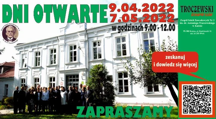 Społeczność szkolna Zespołu Szkół Zawodowych Nr 2 im. dr Antoniego Troczewskiego w Kutnie zaprasza uczniów klas ósmych oraz ich rodziców na Dni Otwarte w dniach 9.04.2022 i 7.05.2022 w godzinach 9.00 – 12.00