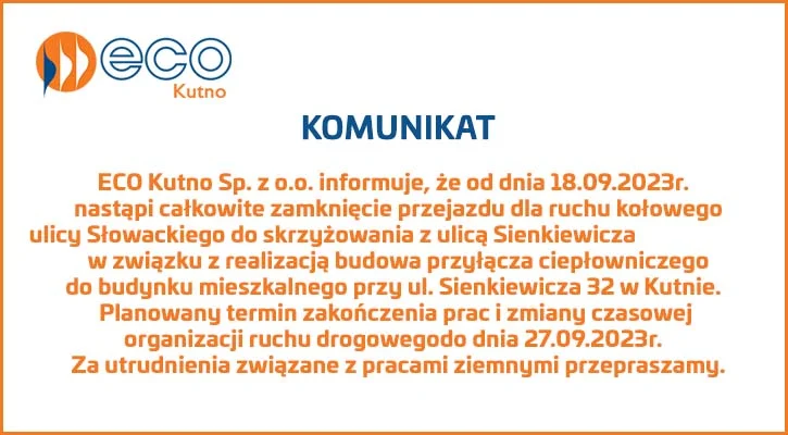 ECO Kutno Sp. z o.o. informuje, że od dnia 18.09.2023r. nastąpi całkowite zamknięcie przejazdu dla ruchu kołowego ulicy Słowackiego do skrzyżowania z ulicą Sienkiewicza w związku z realizacją budowa przyłącza ciepłowniczego do budynku mieszkalnego przy ul. Sienkiewicza 32 w Kutnie. Planowany termin zakończenia prac i zmiany czasowej organizacji ruchu drogowego do dnia 27.09.2023r.