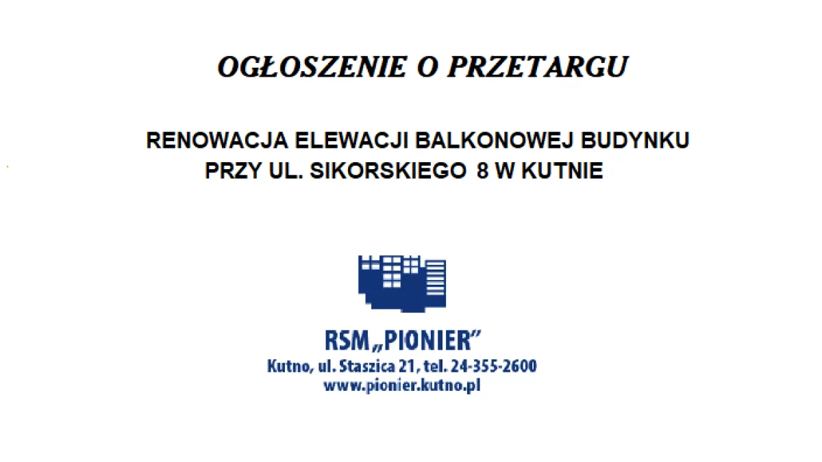 Zarząd Robotniczej Spółdzielni Mieszkaniowej Pionier w Kutnie ogłasza przetarg nieograniczony na: