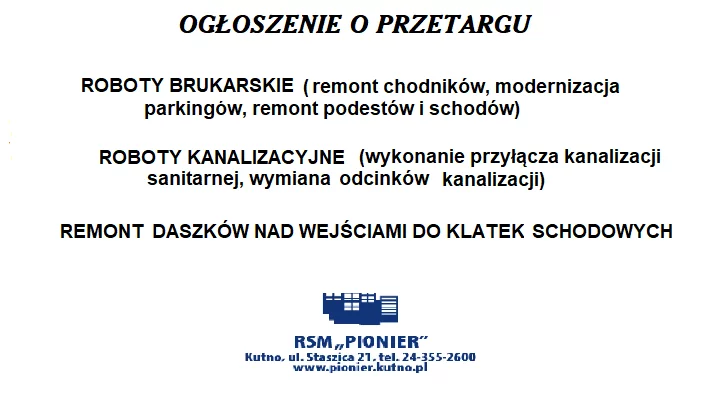 Szczegóły warunków przetargu zawarte są w Specyfikacji Istotnych Warunków Zamówienia, którą można uzyskać za kwotę 61,50 zł brutto w biurze Spółdzielni przy ul. Staszica 21 w Kutnie pok. 24 (tel. 24/355 26 19).