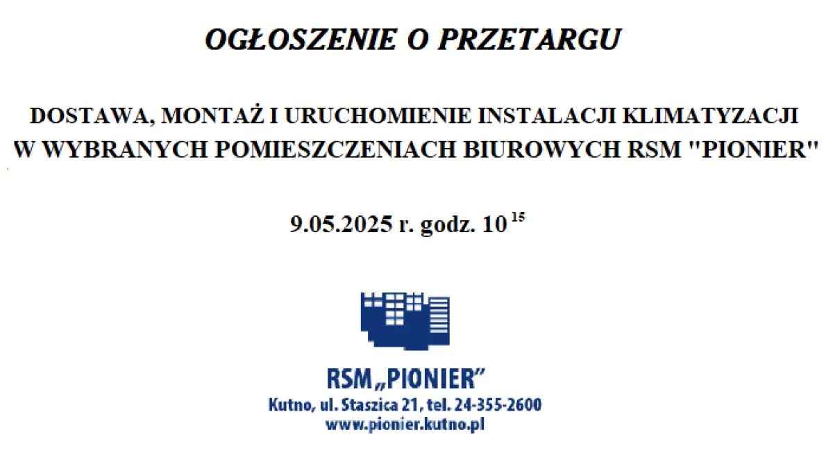 ogłasza przetarg nieograniczony na dostawę, montaż i uruchomienie instalacji klimatyzacji w wybranych pomieszczeniach biurowych RSM „PIONIER” w Kutnie.