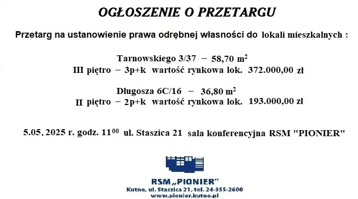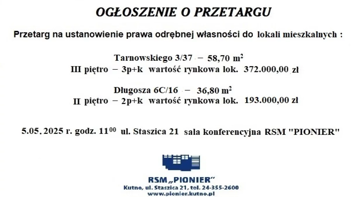 Zarząd Robotniczej Spółdzielni Mieszkaniowej „PIONIER” w Kutnie ogłasza przetarg w formie licytacji na pierwszeństwo ustanowienia prawa odrębnej własności do lokali mieszkalnych z odzysku położonych w Kutnie przy ulicy: