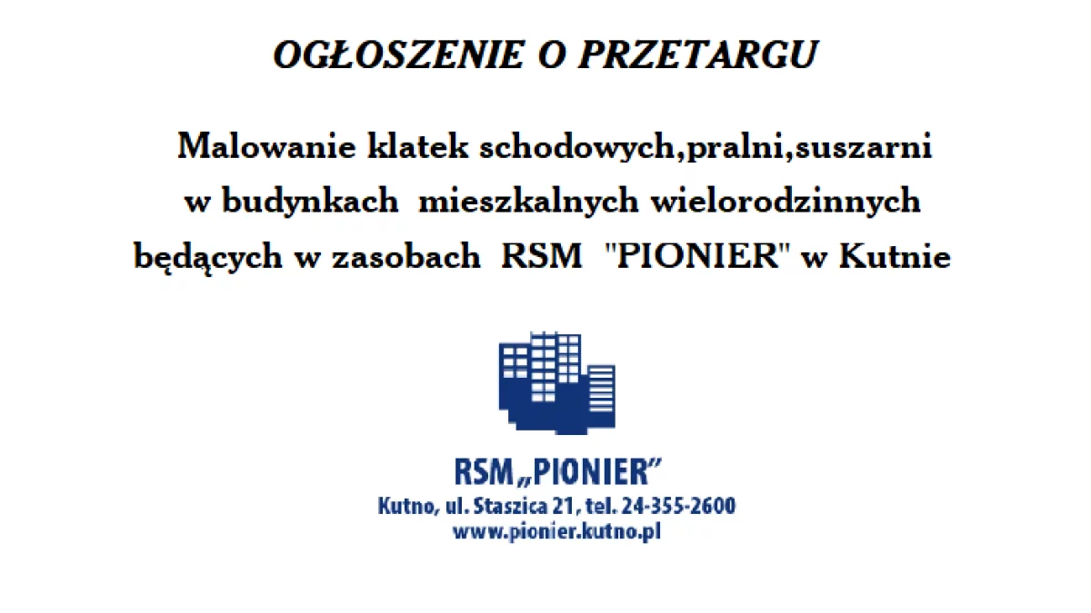 Zarząd Robotniczej Spółdzielni Mieszkaniowej Pionier w Kutnie ogłasza przetarg nieograniczony na malowanie klatek schodowych, pralni, suszarni w budynkach przy ul. Batorego 3, Batorego 15, Grunwaldzka 12, Jagiełły 3, Łąkoszyn IX, Reja 1A, Staszica 18, Staszica 20, Staszica 22, Długosza 6A, Długosza 6B,Długosza 6C, 29 listopada 12A, Kołłątaja 10, Kościuszki 22, Chodkiewicza 1, Chodkiewicza 3, Chodkiewicza 5, Chodkiewicza 5A, Kościuszki 17 w Kutnie.