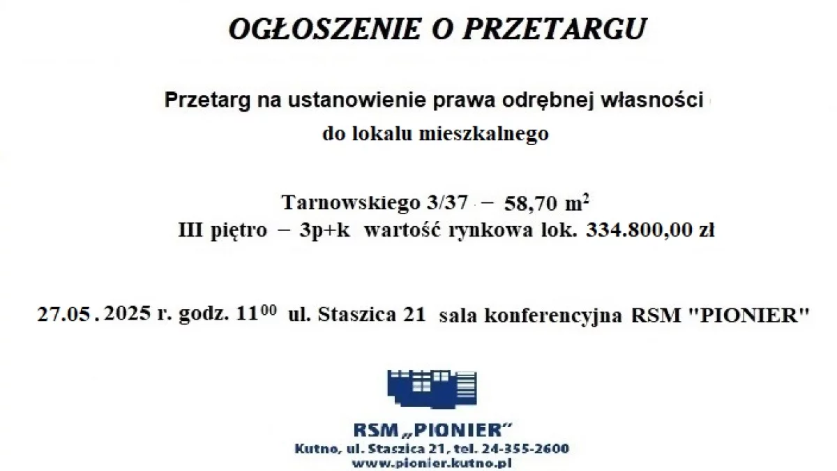 Zarząd Robotniczej Spółdzielni Mieszkaniowej „PIONIER” w Kutnie ogłasza przetarg