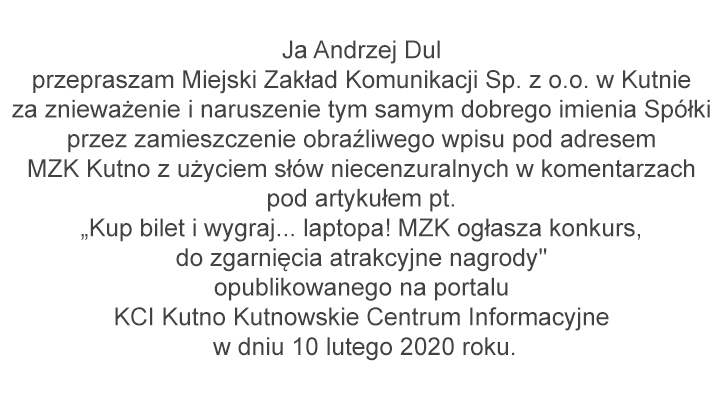 Pan Andrzej Dul przeprasza Miejski Zakład Komunikacji Sp. z o.o. w Kutnie.