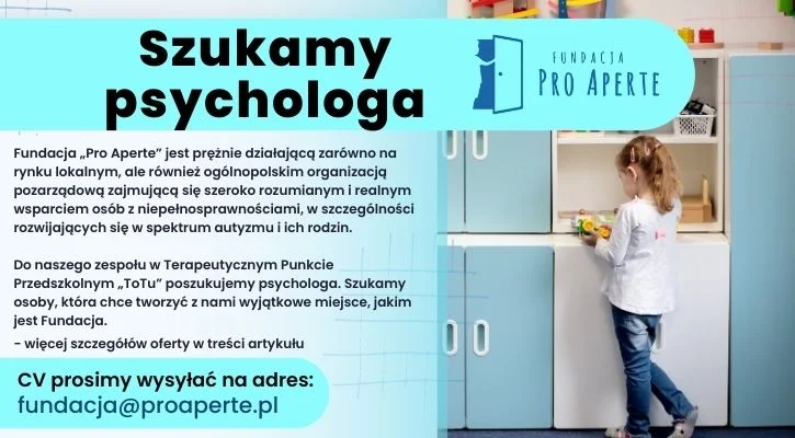 Do naszego zespołu w Terapeutycznym Punkcie Przedszkolnym „ToTu” poszukujemy psychologa. Szukamy osoby, która chce tworzyć z nami wyjątkowe miejsce, jakim jest Fundacja.