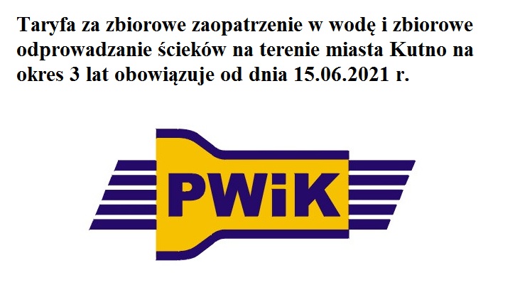 Taryfa za zbiorowe zaopatrzenie w wodę i zbiorowe odprowadzanie ścieków na terenie miasta Kutno na okres 3 lat obowiązuje od dnia 15.06.2021 r.