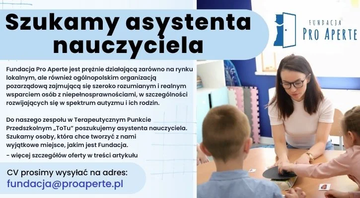 Do naszego zespołu w Terapeutycznym Punkcie Przedszkolnym „ToTu” poszukujemy asystenta nauczyciela. Szukamy osoby, która chce tworzyć z nami wyjątkowe miejsce, jakim jest Fundacja.