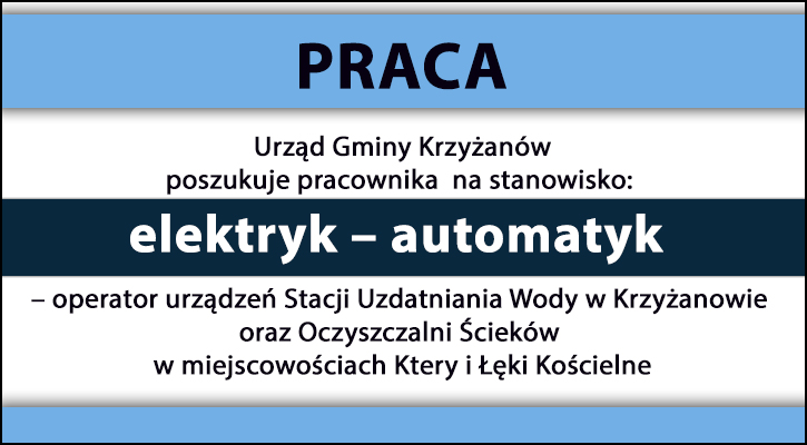 Urząd Gminy Krzyżanów poszukuje pracownika na stanowisko: elektryk – automatyk – operator urządzeń Stacji Uzdatniania Wody w Krzyżanowie oraz Oczyszczalni Ścieków w miejscowościach Ktery i Łęki Kościelne