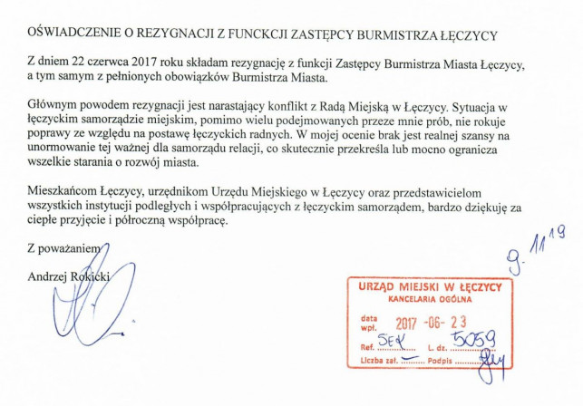 Dziś rano do Urzędu Miasta wpłynęło pismo podpisane przez Andrzeja Rokickiego, informujące o rezygnacji.