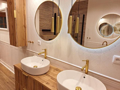 W tej przemyślanej przestrzeni łazienkowej uwagę przykuwa misternie zaprojektowane lustro, które z łagodnymi i płynnymi liniami odzwierciedla aspiracje nowoczesnego designu. Jego okrągła forma z subtelnym, LED-owym podświetleniem tworzy atmosferę ciepła i intymności. Kontrastujące z nim ostre linie geometrycznych płytek i surowych, dretych powierzchni szafek i półek wprowadzają wyciszoną harmonię, a zarazem nowoczesny rygor.Podświetlenie LED nie tylko akcentuje kształt i formę lustra, ale również delikatnie podkreśla strukturę kamienia na ścianach, dodając głębi i tekstury wnętrzu. Wiszące, cylindryczne lampy z surowym wykończeniem dopełniają minimalistycznego, ale ciepłego charakteru przestrzeni, jednocześnie funkcjonując jako nowoczesne akcenty oświetleniowe.Wszystko to komponuje się z naturalnymi odcieniami drewna, które wprowadzają element ziemi i natury, tworząc przestrzeń, która jest zarówno elegancka, jak i przytulna. Dodatkowo, życie do wnętrza wprowadzają starannie dobrane dodatki, takie jak bukiet suszonych traw, który dodaje subtelnej, organicznej nuty. To połączenie surowych materiałów i delikatnego światła jest niczym poezja wizualna, która przemawia do zmysłów i odzwierciedla nowoczesne podejście do designu łazienek.