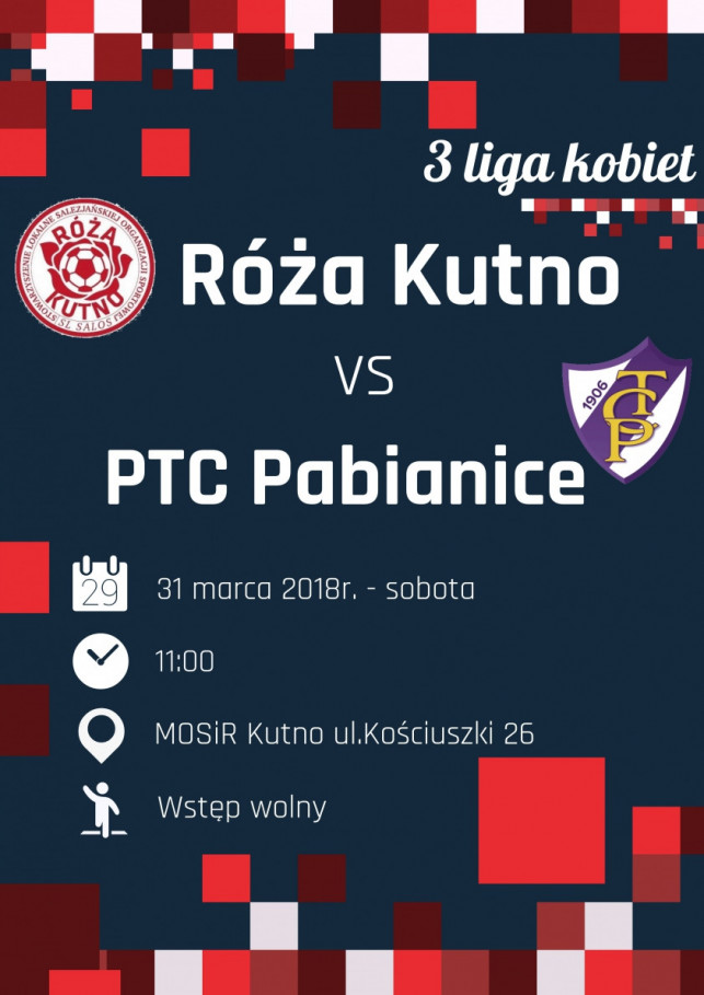 W sobotę 31 marca 2018 r. w ramach 14 kolejki III Ligi Kobiet, Róża Kutno podejmie na własnym boisku drużynę PTC Pabianice. Początek spotkania o godz.11:00 na stadionie im Henryka Reymana przy ulicy Kościuszki 26.