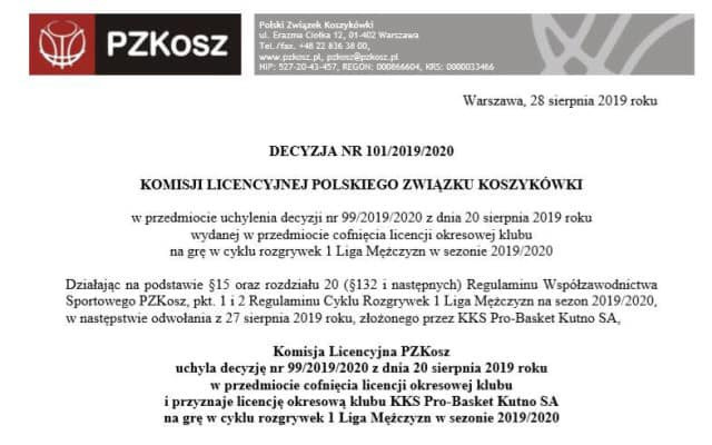 SportJak donosi fanpage KKS Pro-Basket Kutnno: Decyzją Komisji Licencyjnej Polskiego Związku Koszykówki w przedmiocie uchylenia decyzji z dnia 20 sierpnia 2019 roku wydanej w przedmiocie cofnięcia licencji okresowej klubu na grę w cyklu rozgrywek 1 ligi mężczyzn w sezonie 2019/2020. Działając na podstawie § 15 oraz rozdziału 20 (§ 132 i następnych) Regulaminu Współzawodnictwa Sportowego PZKosz pkt. 1 i 2 Regulaminu Cyklu Rozgrywek I Ligi Mężczyzn na sezon 2019/2020, w następstwie odwołania z 27 sierpnia 2019 roku, złożonego przez KKS Pro-Basket Kutno S.A.