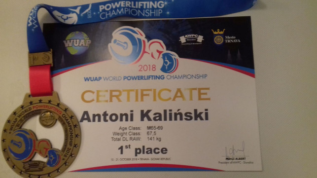 Antoni Kaliński startując w kat. wagowej do 67,5 kg. i grupie wiekowej 65-69 lat brał udział w konkurencji zwanej Martwym Ciągiem, zajął pierwsze miejsce zdobywając tytuł Mistrza Świata z wynikiem 141.0 kg. Uzyskany rezultat jest nowym Rekordem Świata tej kat. wagowej i grupie wiekowej.