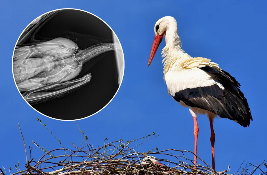 Badanie obrazowe RTG wykazało, że bocian został postrzelony. W ciele ptaka znaleziono śruty, co tłumaczyło niemożność jego lotu. Wszystko wskazuje na to, że do postrzału doszło w rejonie miejsca, w którym zwierzę zostało znalezione.