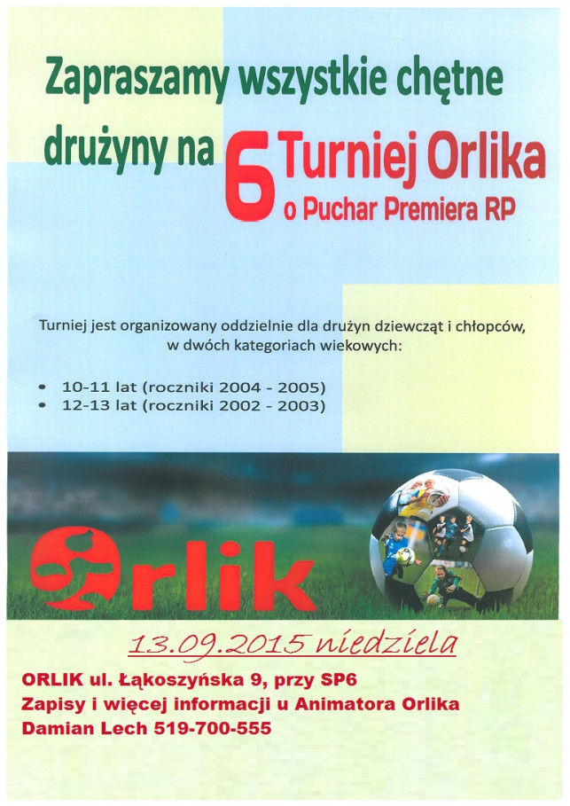 Jeżeli chcecie zagrać w Turnieju Orlika zgłoście swoją drużynę animatorowi orlika odpowiedzialnemu za organizację turnieju - Damian Lech (519-700-555) lub na orliku ul. Łąkoszyńska 9, przy SP6.