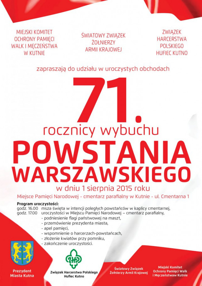 WydarzeniaMiejski Komitet Ochrony Pamięci Walk i Męczeństwa w Kutnie, Światowy Związek Żołnierzy Armii Krajowej oraz Związek Harcerstwa Polskiego Hufiec Kutno zapraszają do udziału w uroczystych obchodach 71. rocznicy wybuchu powstania warszawskiego, które odbędą się 1 sierpnia na cmentarzu parafialnym w Kutnie w Miejscu Pamięci Narodowej.Program uroczystości:godz. 16 - msza święta w intencji poległych powstańców w kaplicy cmentarnej,godz. 17 - uroczystości w Miejscu Pamięci Narodowej - cmentarzu parafialnym,- podniesienie flagi państwowej na maszt, - przemówienie prezydenta miasta,- apel pamięci,- wspomnienie o harcerzach-powstańcach,- złożenie kwiatów przy pomniku,- zakończenie uroczystości.