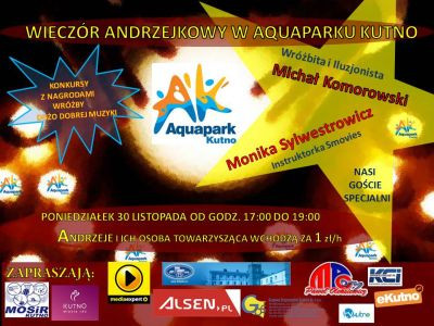 Wśród wielu imprez, które organizuje MOSiR w Kutnie nie może zabraknąć „Wieczoru Andrzejkowego” oczywiście w Aquaparku Kutno. Również i w tym roku przygotowaliśmy wiele atrakcji dla naszych mieszkańców. Będą konkursy z nagrodami , a tegoroczni goście specjalni to: Monika Sylwestrowicz, która poprowadzi zajęcia smovies oraz wróżbita i iluzjonista Michał Komorowski. Ten niezwykły wieczór rozpocznie się 30 listopada o godzinie 17:00, a potrwa do 19:00. W tym czasie Andrzeje wraz z osobą towarzyszącą będą mogli bawić się z nami tylko za 1 zł /h. Nagrody ufundowali : Prezydent Miasta Kutno, MOSiR, TBS w Kutnie , GOŚ, sklep Media Expert, dostawca internetu MPC, sklep komputerowy Alsen Rafał Przyłoga.